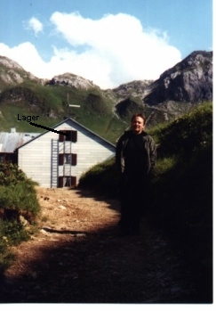 Gotlinde vor der Kemptner Hütte nach dem erfolglosen Versuch an Pfeiler 2 Empfang für das Handy zu bekommen.